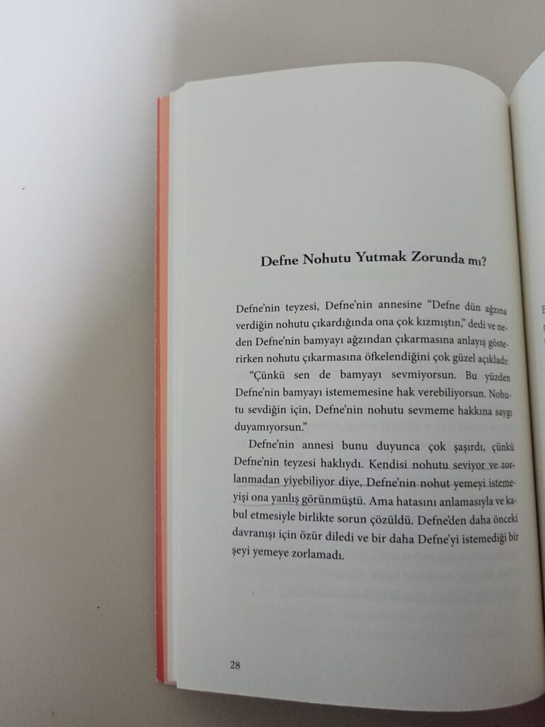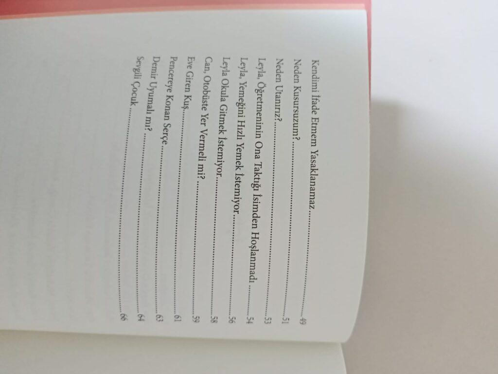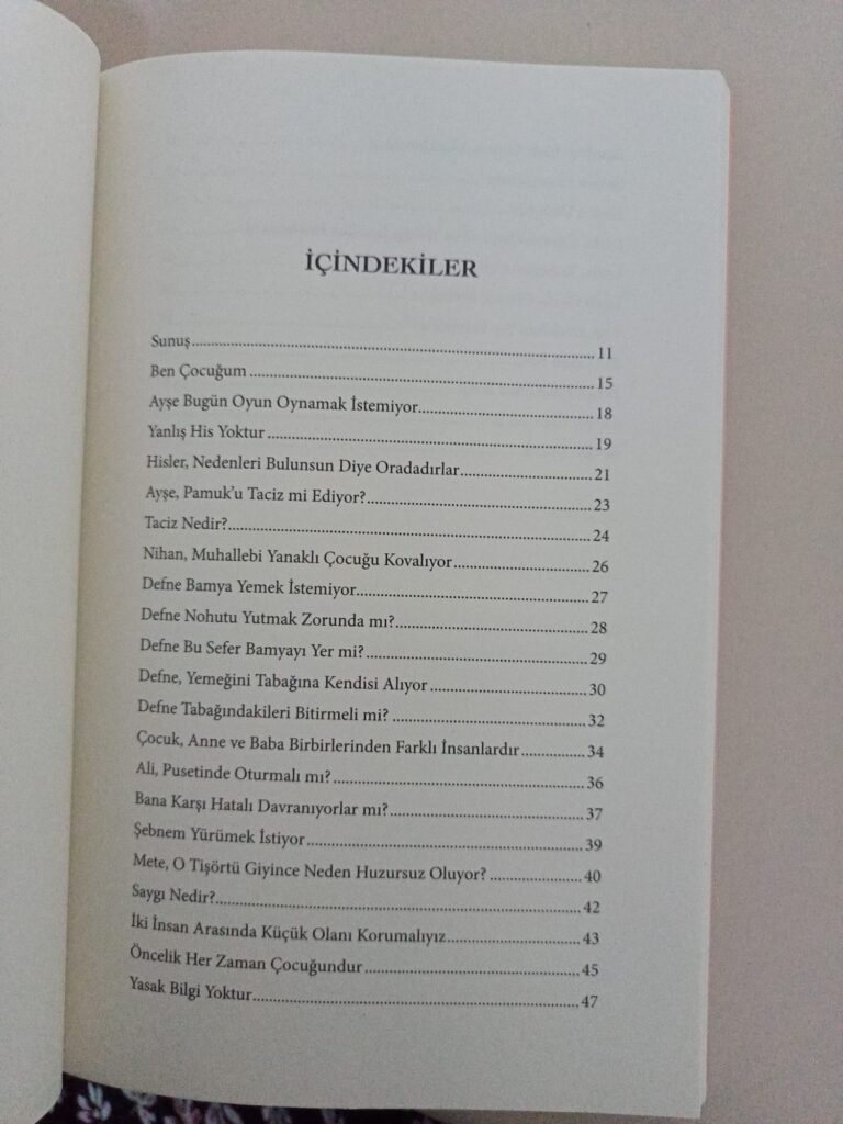 Bu noktada çocukların hayatını değiştirecek kadar önemli bir yere sahip. Onların anlayacağı şekilde yazılmış, birçok örnekle zenginleştirilmiş. İçerisinde toplumun ve ebeveynlerin yanlış yönlendirme, yetiştirmesine bağlı olarak gelişen söz ve davranışların tüm baskıya rağmen yanlış olduğunun farkındalığı çocuklara veriliyor. Örneğin yemek yemeyi istemeyen veya tabağını bitirmeyen çocuğa karşı verilen kızgın davranışın doğru olsaydı kötü hislere sebebiyet vermeyeceği örnek olaylarla anlatılıyor. Kitap bu şekilde örnek olay ve örnek kişilerle ufak başlıklar halinde ilerliyor. Aşağıda içindekiler kısmını ve içeriğinden bir örnek görebilirsiniz.